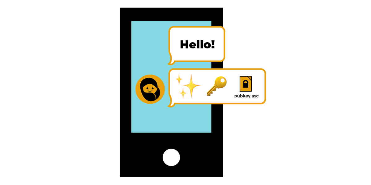 စမတ်ဖုန်းပေါ်မှာ သင့်သူငယ်ချင်း အက်စ်ရာဆီက လို့ပြောတဲ့ မက်ဆေ့ချ်ကို တွေ့နိုင်ပါတယ်။ သူမက “ဟဲလို” လို့မက်ဆေ့ချ်ပို့ပြီးတာနဲ့ အများသုံးဝှက်စာသော့  (pubkey.asc) နဲ့ အီမိုဂျီတွေပါတဲ့ မက်ဆေ့ ထပ်ပို့ပါတယ်။
